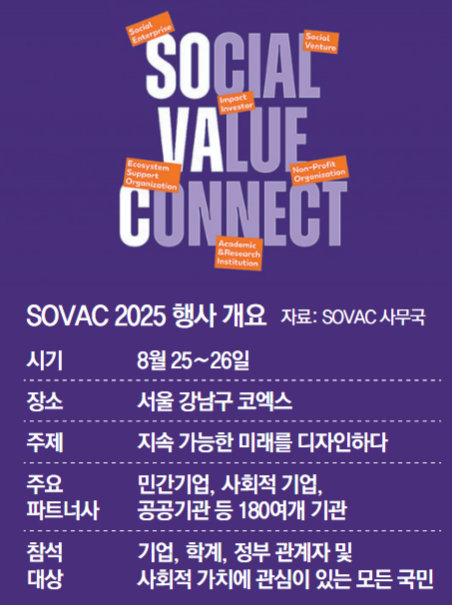 ‘SOVAC 2025’는 이달 25, 26일 이틀 동안 서울 강남구 코엑스에서 ‘지속 가능한 미래를 디자인하다’를 주제로 제2회 대한민국 사회적 가치 페스타와 함께 개최된다. 올해는 사회적 기업, 소셜벤처, 비영리조직 등 180여 개 파트너사들이 참석한다. 이번 행사에서는 △고령화사회의 시니어 자립 △청년과 로컬의 동반 성장 △사회적 금융 활성화 등을 주제로 14개의 강연 및 토의 세션이 진행된다.