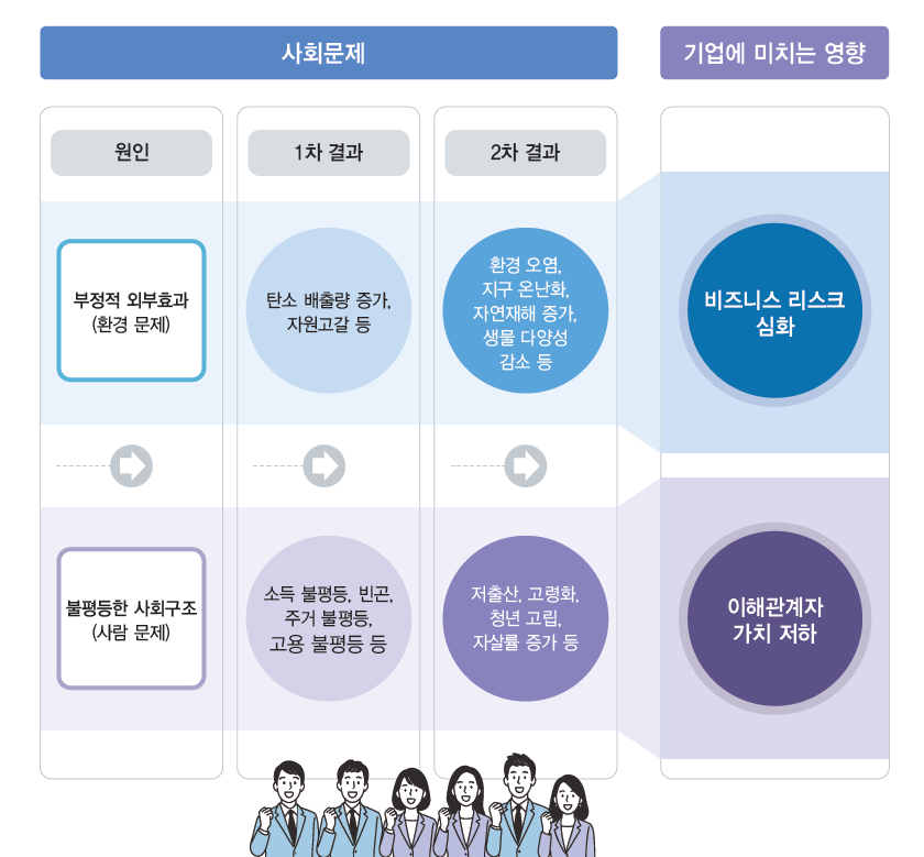 자연재해 등의 ‘환경’ 문제와 불합리한 사회구조로 인해 유발되는 ‘사람’ 문제는 사회 문제의 발생 원인으로서, 기업에도 부정적 영향을 미치고 있으며, 비즈니스 리스크 심화와 이해관계자 가치 저하를 야기한다.